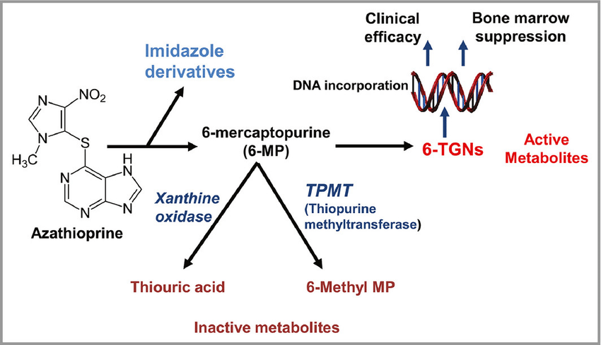 This is because this enzyme helps break down these components into mercaptopurine, which is the activate metabolite which stops purine synthesis.