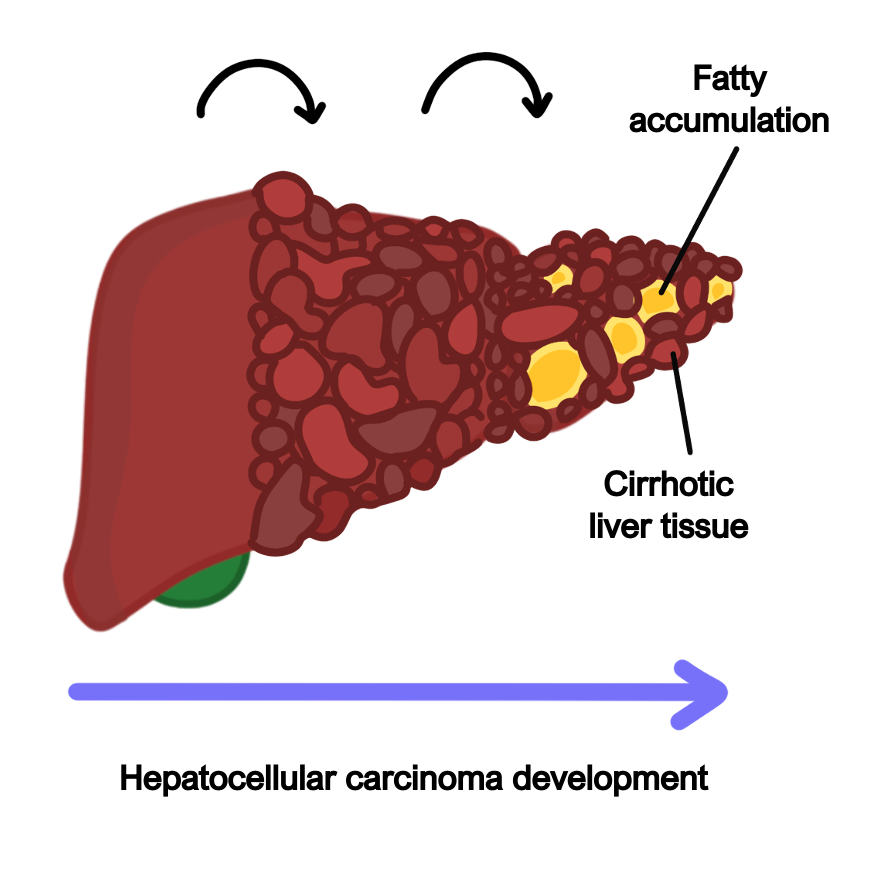 Leads to liver cirrhosis with increased risk of hepatocellular carcinoma