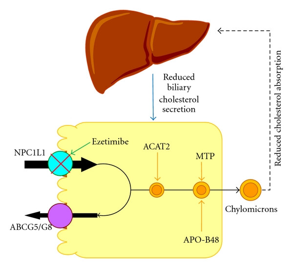 Because less cholesterol is absorbed, the liver increases LDL uptake — lowering circulating LDL levels.